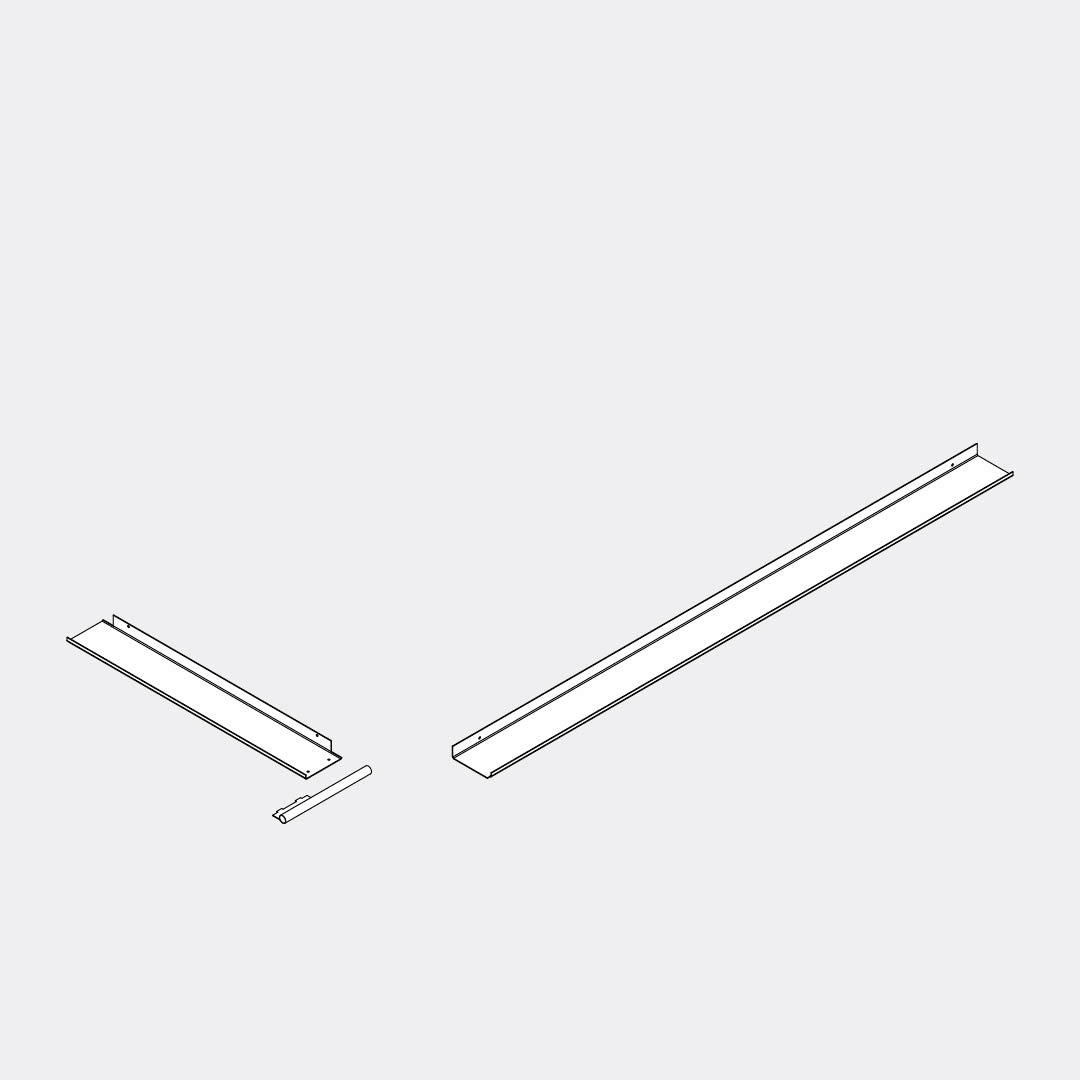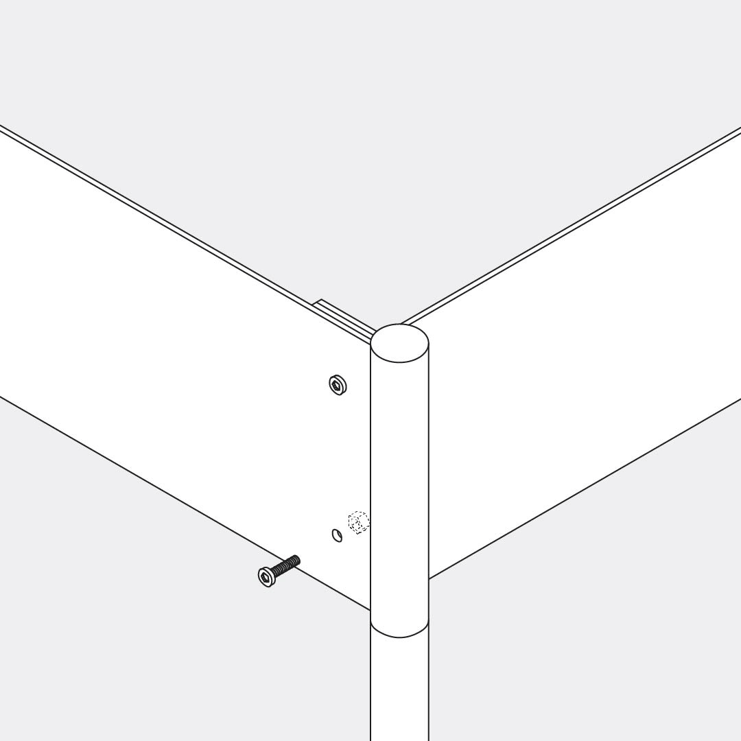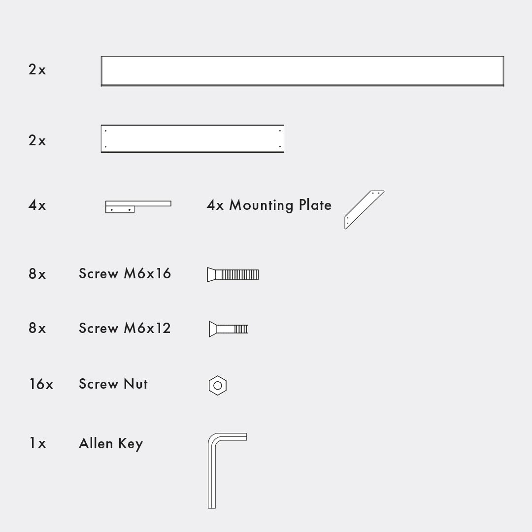 Place and hold the longer frame part in a horizontal position. Connect the shorter part and leg by using the M6x16 screws and nuts. Hold the nut in the fixed position and use the Allen key to screw them both tightly.