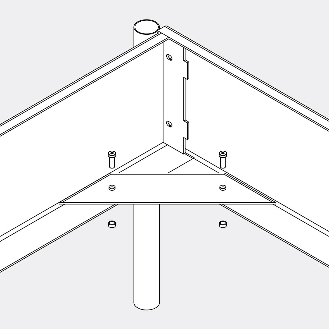 Screw the 4 mounting plates onto the corners of the frame. Use M6×12 screws and screw nuts. Make sure all connections are tightened securely.