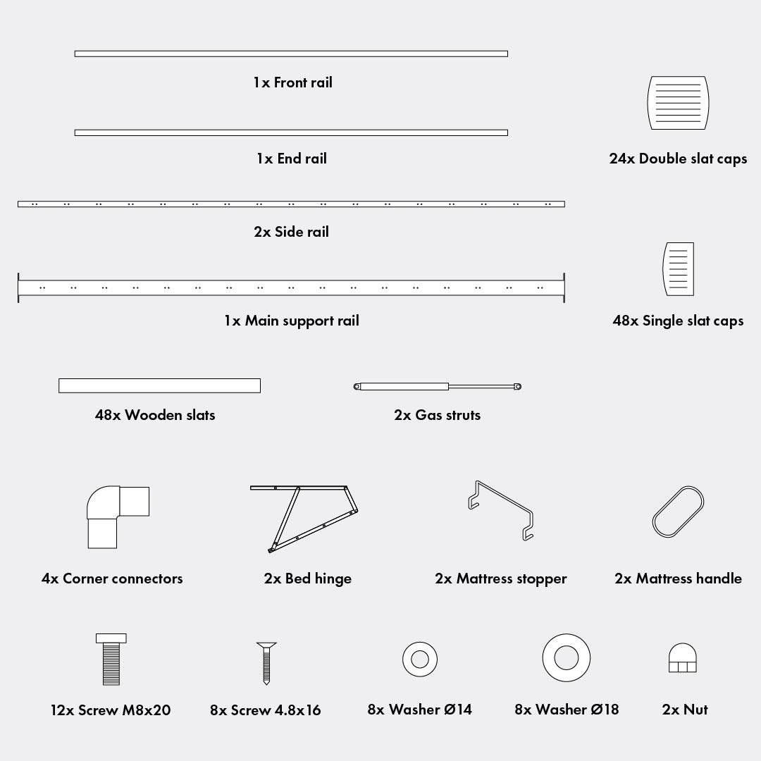 Assemble the slatted frame: check that the box is undamaged and that all elements are included.