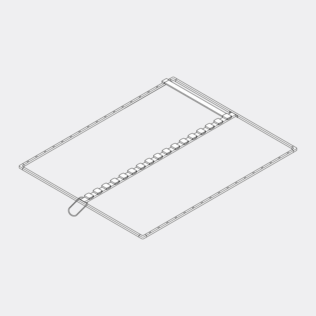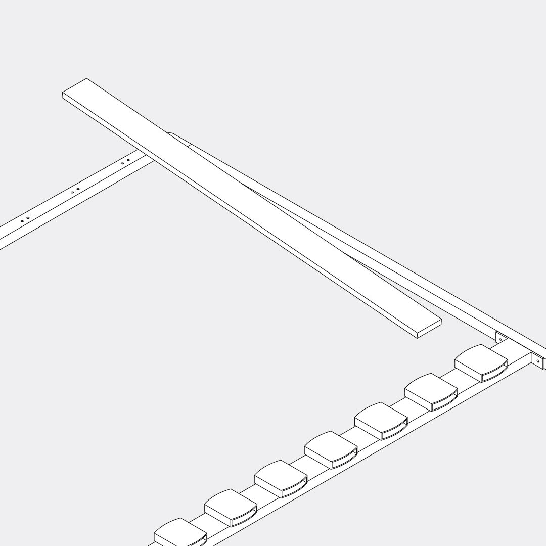 Insert the slats into the frame: place each slat into the double slat cap, then fit a single slat cap onto the other end of the slat and attach it to the frame. Repeat this step for each slat.