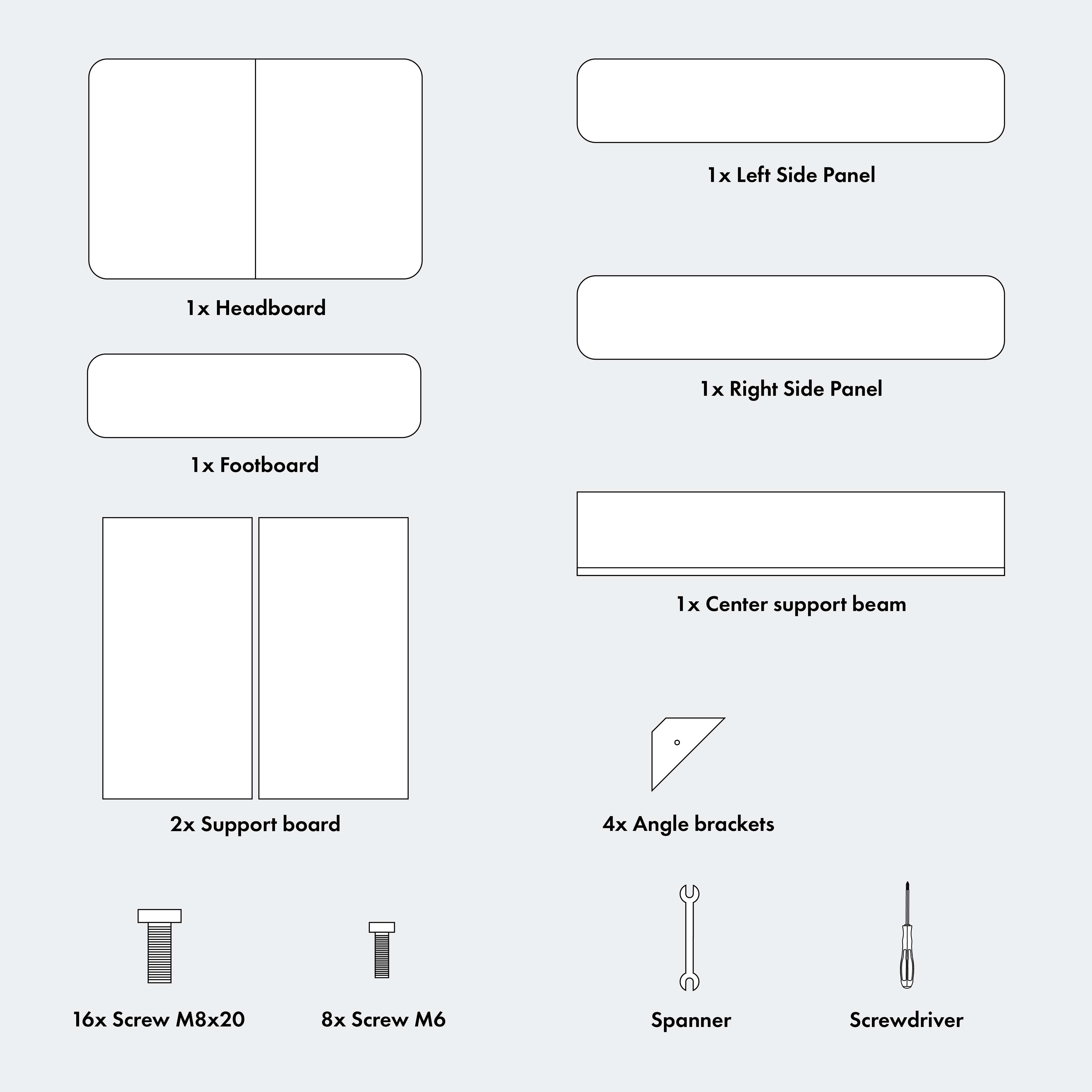 Attach the side panels to the headboard: slide the side panel fittings onto the bolts protruding from the headboard, then tighten with the Spanner.