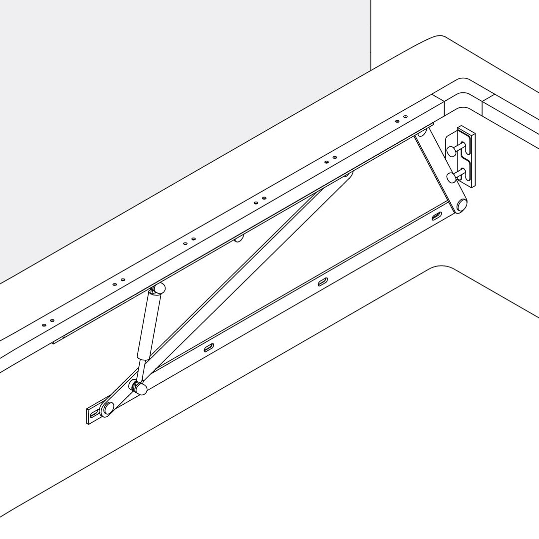 Attach the gas struts to the bed hinges. On each protruding rod, place one Ø14 washer, then the gas strut, then the second Ø14 washer, and secure everything with a nut, as shown in the animation.