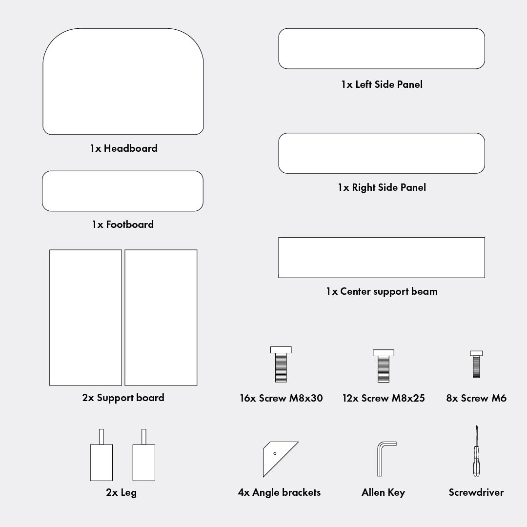 Attach the side panels to the headboard: slide the side panel fittings onto the bolts protruding from the headboard, then tighten with the Allen key.
