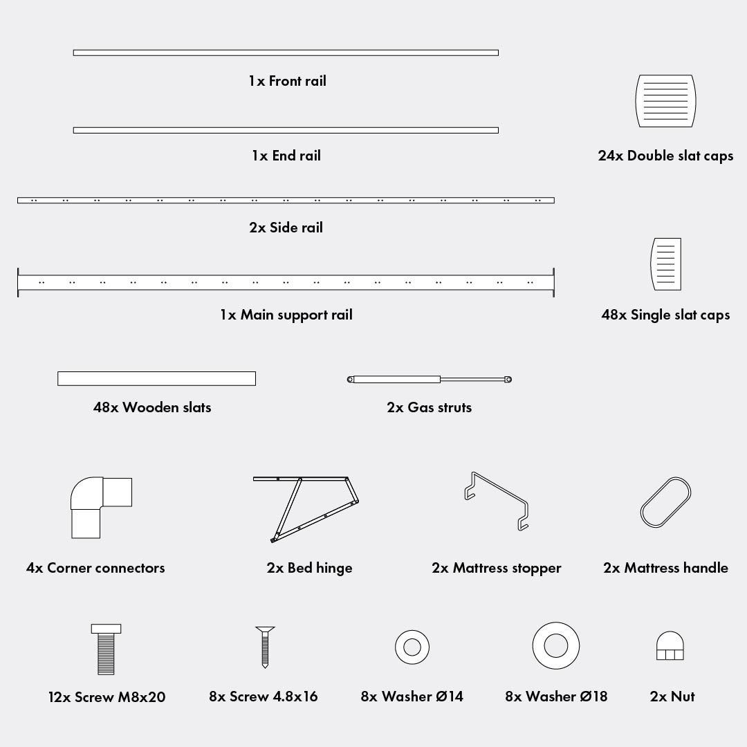 Assemble the slatted frame: check that the box is undamaged and that all elements are included.