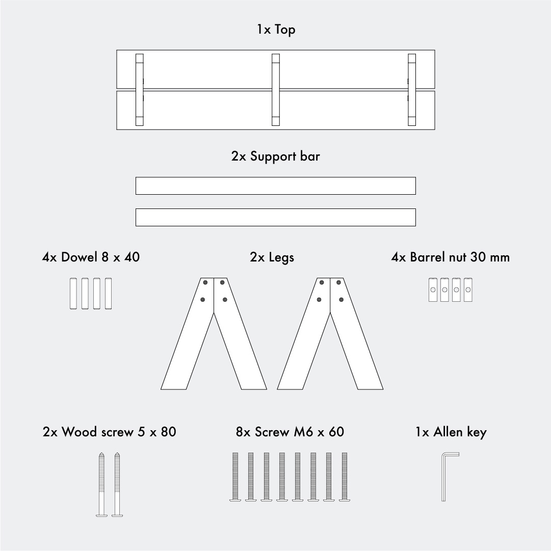 Place the bench top flat on the floor with the top surface facing down. Position the support bars with the attached legs onto the bench top, making sure the screw holes in both elements align. Fasten the legs to the top using the remaining M6 × 60 screws and the Allen key. Use the 5 × 80 wood screws in the support bars as shown in the illustration.