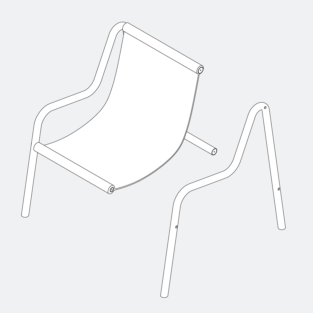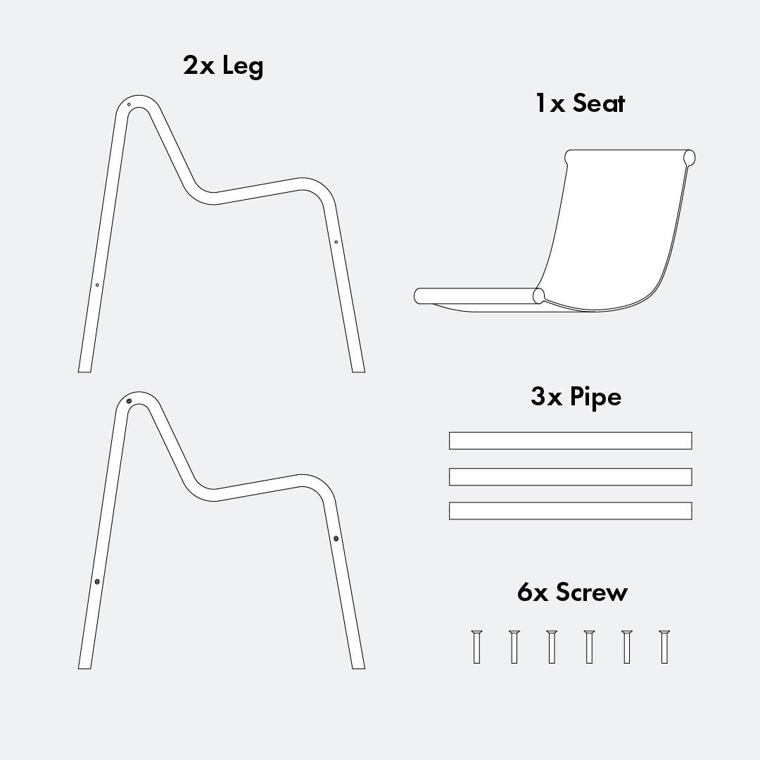 Install the sling seat. Screw the two protruding tubes to the leg and tighten the screws using the Allen key.